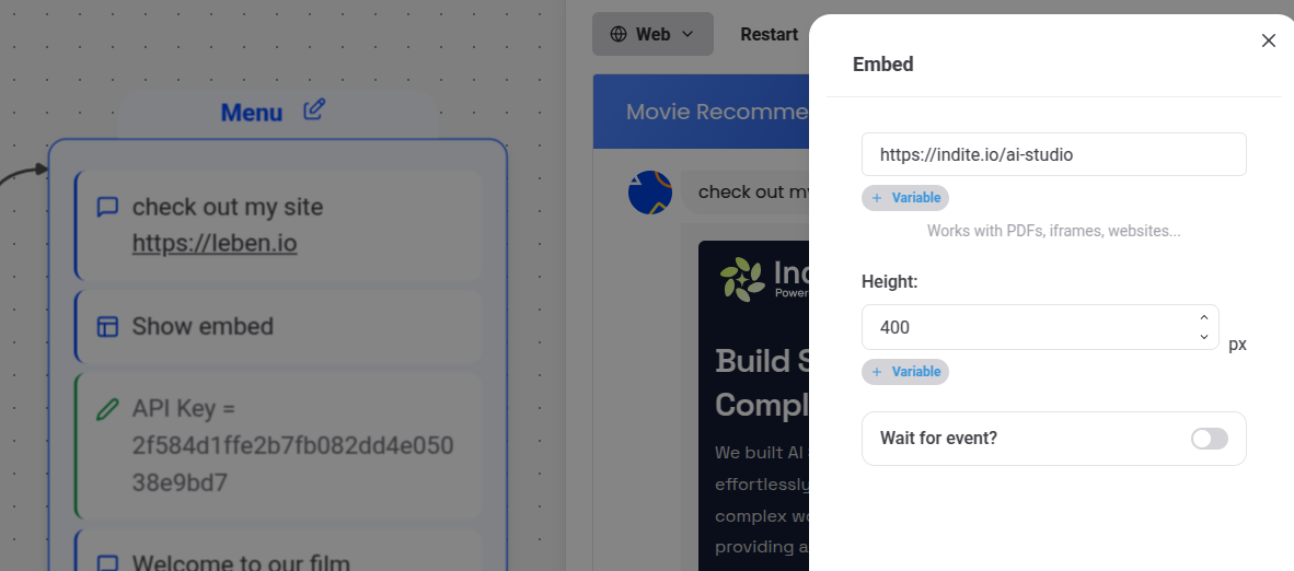 Add an Embed Bubble block to your bot’s flow in the Indite editor: