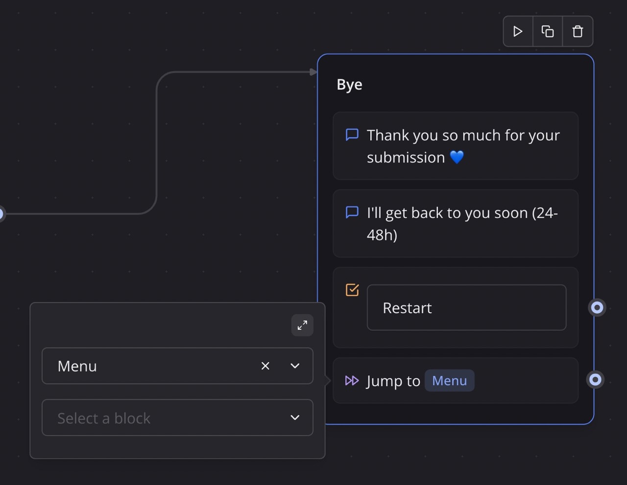 The Jump block allows you to redirect your bot's flow to a specific block, helping you maintain a clean and organized workflow by avoiding complex branching.