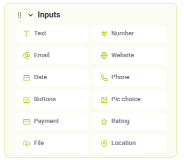 Input blocks prompt users for input, pausing the conversation until the user responds. These blocks collect data such as text, selections, or locations.