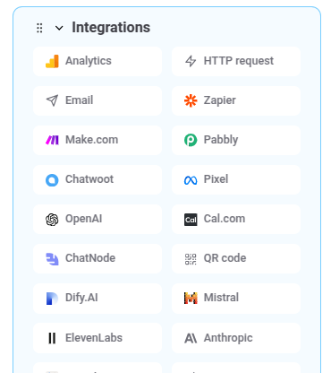 Integration blocks allow your bot to interact with tools like WhatsApp, CRMs, or analytics platforms.